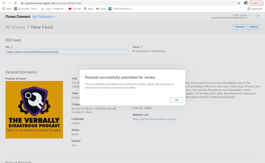 I had previously shared that I submitted The Verbally Disastrous Podcast & Construction Tales Audio Blog to Apple Podcasts. I have to follow up on that submission. I didn’t stop there. I found out that Soundtrap doesn’t have an RSS feed for loading to Spotify. Soundtrap only integrates onto Spotify. I require a hosting platform in order to get my podcast onto Apple Podcasts. I usually use Chrome as my browser for my transactions. I had to use Internet Explorer and created a second Anchor profile. I then used the Anchor’s RSS feed and submitted The Verbally Disastrous Podcast With Leslie M. Jasper & Melissa Polito to Apple Podcasts: