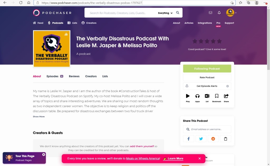 I also created a brand new author profile and launched the Verbally Disastrous podcast on Podchaser. I still have to add the Audio Blog to the Podchaser platform as well. I have seen the platform logo before but I couldn’t place it. I am not sure who uses this platform. I am trying to be on as many as possible. Here is the link to what I have worked on so far: