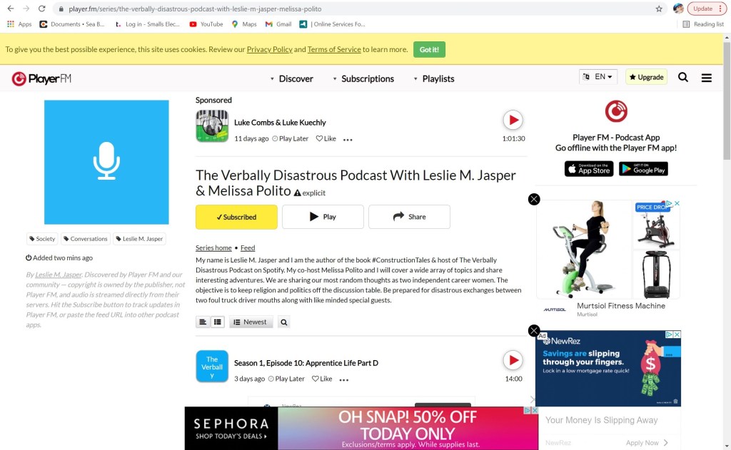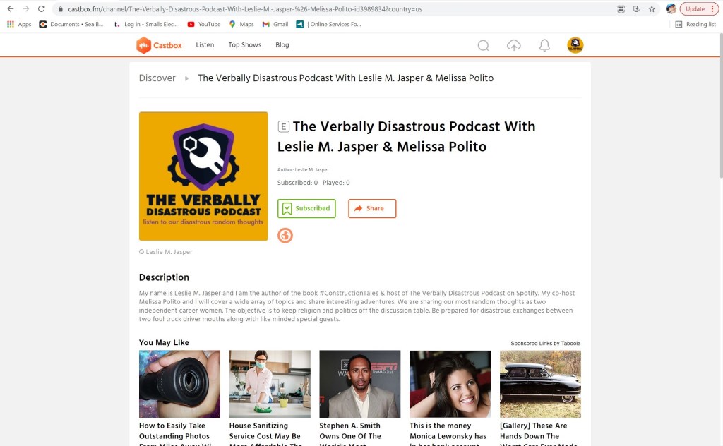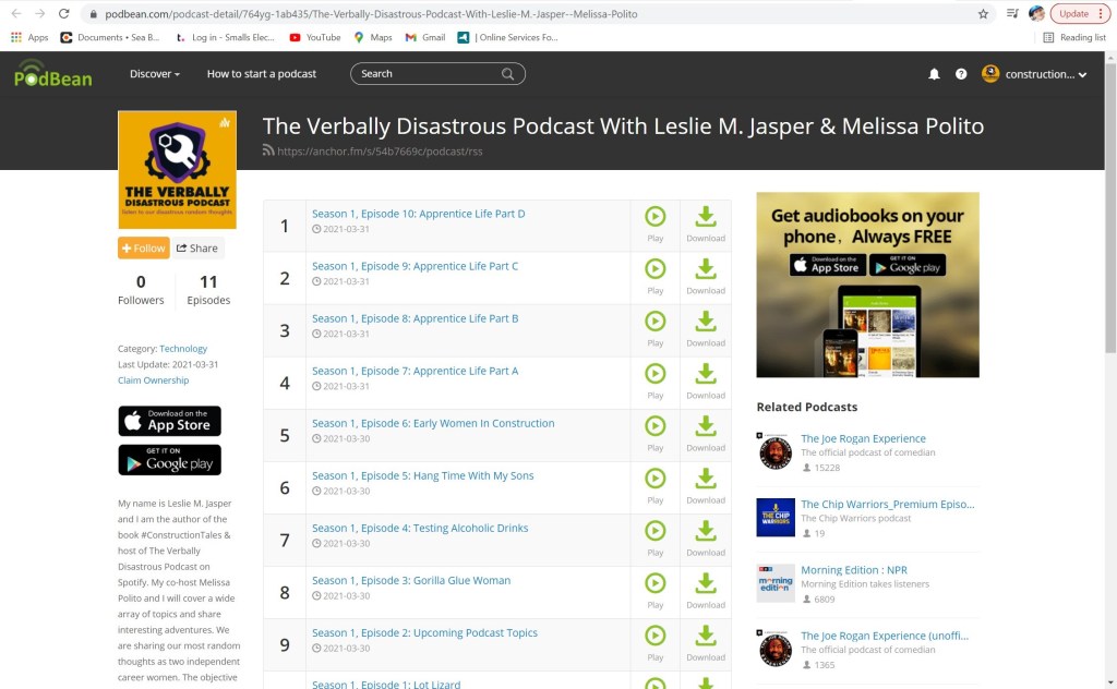 -The Audio Blog: Verbally Disastrous Podcast & Construction Tales Blog. Now available on: Apple Podcasts, Anchor, Breaker, Google Podcasts, Pocket Casts, Radio Public, and Spotify. More platforms are coming soon.