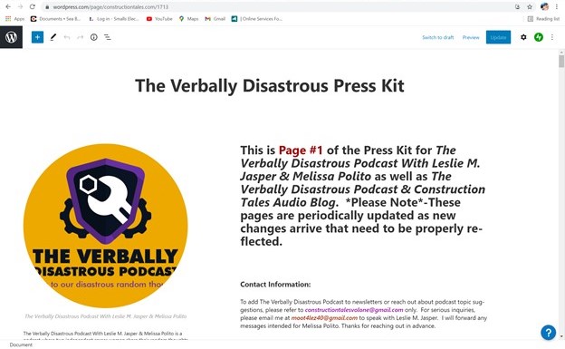 -The Audio Blog: Verbally Disastrous Podcast & Construction Tales Blog. Now available on: Apple Podcasts, Anchor, Breaker, Deezer, Google Podcasts, Pocket Casts, Radio Public, and Spotify.  I will announce more platforms very soon.