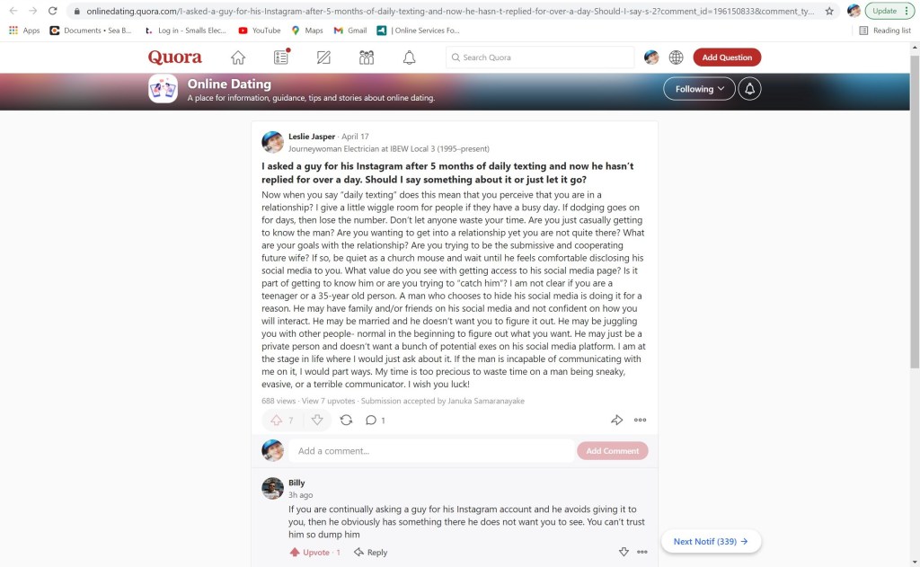 The topic of discussion was from a person, unsure if the writer is male or female or binary, who was trying to get a guy’s Instagram account. This request is after five months of daily texting. It didn’t reveal if the two people were dating or merely loosely communicating. I am aware that I am running off of very limited information. I feel empathy for a person who is not on the same page as the other person. This could be as a result of mismatched words and action, poor communication, an obsession, etc. It is not easy to blend two people of the opposite gender, different childhoods, different cultures, different geographic areas, different family dynamics, etc. Come to think of it, it is amazing that people can cohabitate under such different circumstances. This is actually somewhat close to what Melissa and I recently discussed for podcast Episode #14 that I am almost done with editing. It is not easy to manage a relationship if there is distance or other major barriers in the relationship. Life is rough when one partner cares less than the other partner. I am convinced that the dynamics are never equal. I have quite a few years of relationship experience that I believe makes me qualified to respond to the question. I offered the same advice as I would provide to my sons. Here is the posed question and my subsequent response: