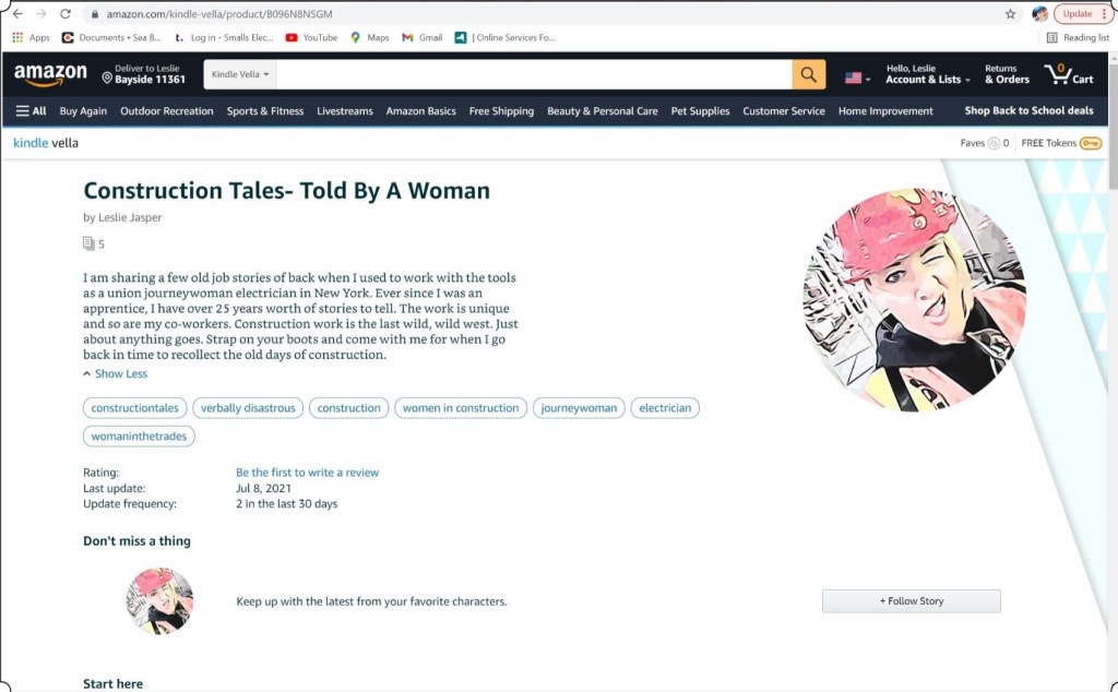 I was alerted, more so I “noticed”, about this Kindle Vella short story project around the beginning of the year. I opted to carve out time to write out a series of short stories from back when I worked with the tools as a journeywoman electrician in New York. As of today, I have released 5 short stories onto my Kindle Vella Library. My Kindle Vella Library is entitled, Construction Tales-Told By A Woman. Each story is roughly 5,000 words long. I plan to write out enough stories so that I can put together Construction Tales: Volume 2 in the near future. Here are the photos of the Kindle Vella Library and my link to my short stories on Amazon: