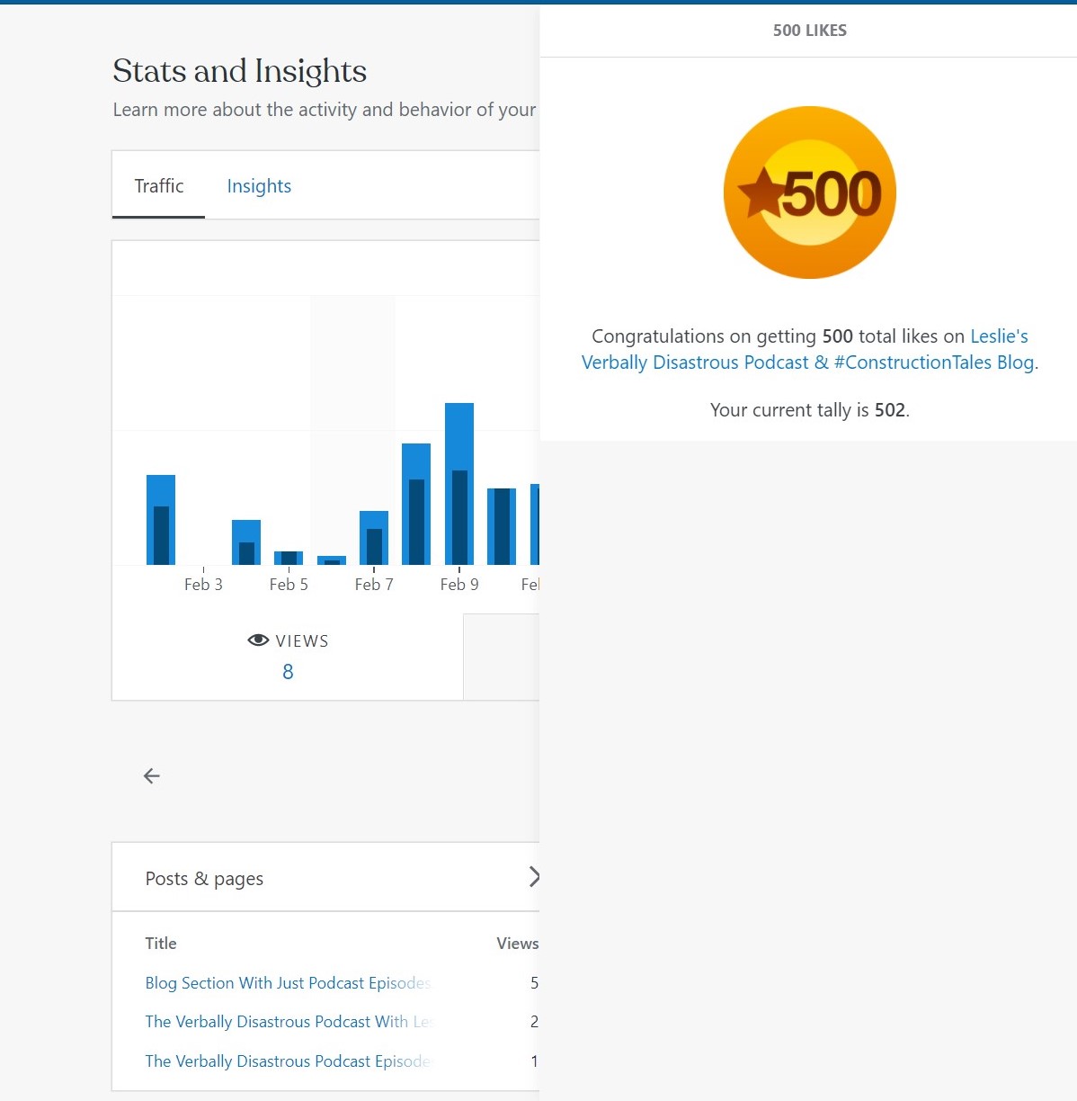 I want to say thank you to everyone for stopping by my blog!!! This extends as well to my Verbally Disastrous YouTube channel, Spotify, Soundcloud, Amazon, Barnes & Noble, and Audible for both #VerballyDisastrous & #ConstructionTales!! I hit a milestone of 500 Likes on my content in a short amount of time!! THANK YOU!! I often conclude my posts with a thank you to viewers for stopping by- it comes from the bottom of my heart. I would be talking to myself if it wasn’t for you all checking in. 😛 I started my journey in 2013 with the concept of blogging via Blogger. This was after the release of my first book #ConstructionTales. I just shifted platforms to Word Press as of January 20, 2021. I still copy my Word Press blog onto my two older Blogger platforms. For those who come on my blog to view and do not hit the like button, I thank you as well. I thank you all that are guilty for my increased book sales in paperback, e-book, and audio forms. At some point, I am going to get my illustrator to finish my first children’s book entitled, Not All Girls Play With Dolls. I need to force myself to finish Construction Tales: Volume II: My Illuminated Path Continues… so I can release on Amazon as well. Of course my fun project is The Verbally Disastrous Podcast With Leslie & Melissa on Spotify & YouTube & Soundcloud. I just started that project a few weeks ago on Spotify on February 8, 2021. I am working on releasing Episode 4: Testing Alcoholic Drinks this week. That episode is surprisingly funny! I will announce that release very soon. Again, I cannot thank people enough for stopping by. Be warm, dry, and safe! Peace out Cub Scout!